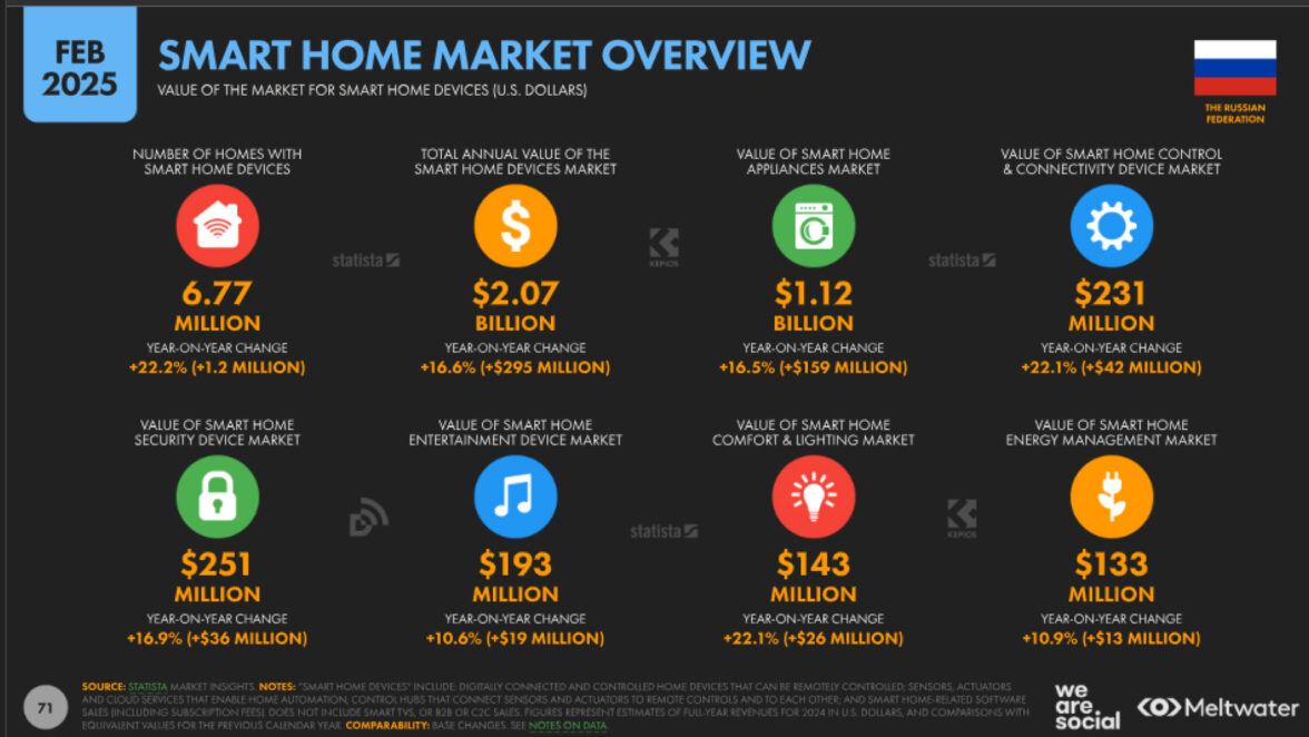 Отдельный рост наблюдается в сегменте «умных» устройств. В 6,77 млн российских домов уже установлены smart-гаджеты, а объём рынка умной электроники достигнет 2,07 млрд долларов.