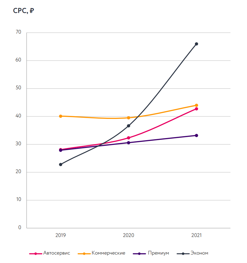 С 2019 по 2021 гг. отмечается рост стоимости клика во всех сегментах. Кроме постоянно растущей стоимости аукциона, увеличения количества форматов рекламных систем, конкурирующих друг с другом, важным фактором, влияющим на рост СРС, стали автоматические стратегии.