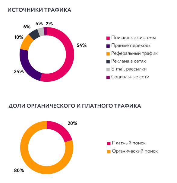 Основной источник трафика для автодилеров и производителей – поисковые системы, из них приходит примерно 50% всех посетителей сайтов. Доля платного трафика выросла по сравнению с предыдущим годом и составляет около 20%.