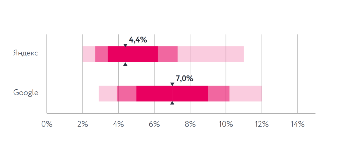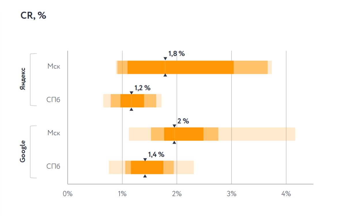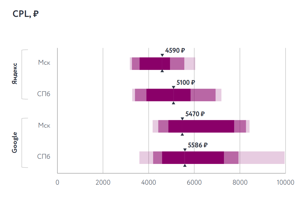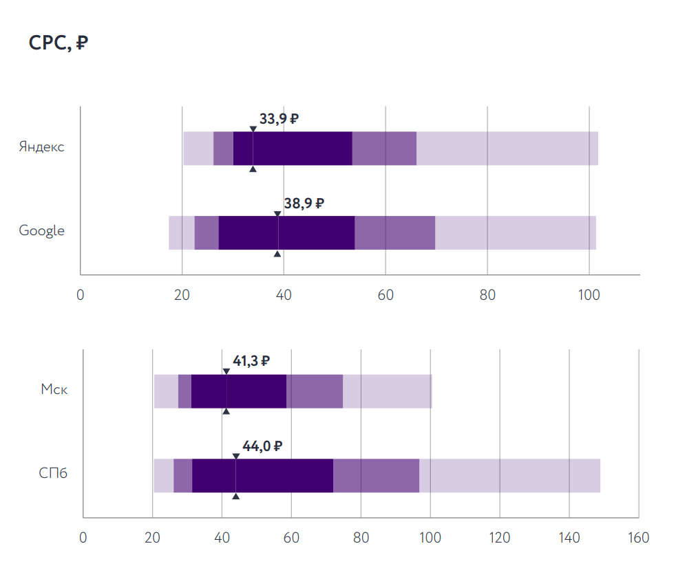 CPC в Москве и Санкт-Петербурге находится примерно на одном уровне. Стоимость клика в Google выше, чем в Яндексе.