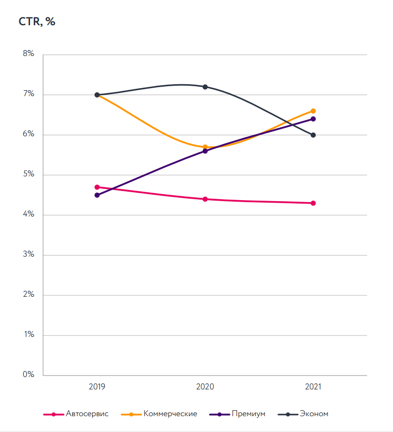 В динамике мы наблюдаем рост показателя CTR в сегментах премиум и коммерческих авто. К этому привело увеличение спроса в этих сегментах. В сегменте премиум-автомобилей спрос увеличивается из года в год, как показывает исследование Яндекса. А в сегменте коммерческого транспорта рост заметен лишь с 2021 года, за счет лизинга. Одна из ключевых причин — развитие служб доставки.