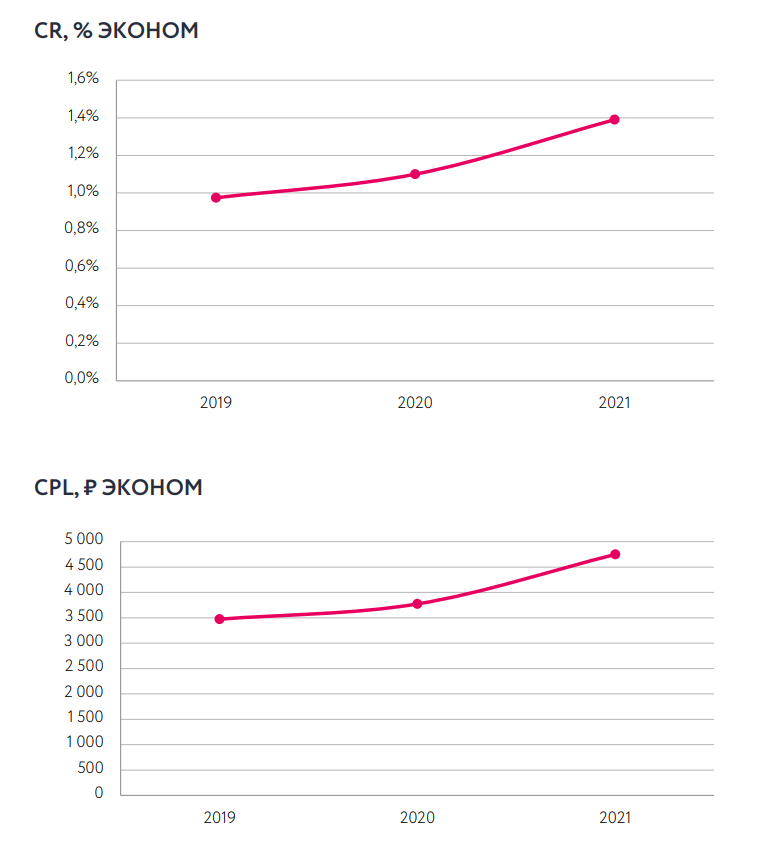 Рекомендуем учитывать все действия пользователей на сайте, которые приводят к обращениям в отдел продаж. Можно сделать дополнительные кликабельные элементы с целью использовать их как микроконверсии. Этот способ может помочь увеличить CR в качественное целевое действие.Стоимость за лид (CPL) в подкатегории Эконом.