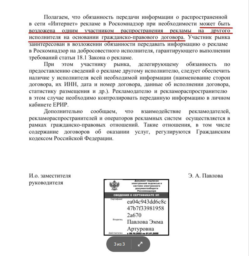 Для Роскомнадзора важен факт наличия отчетности, а кто его технически осуществил — участник рекламной цепочки либо не участник рекламной цепочки, Роскомнадзору не принципиально. Ведомство считает, что данная практика возможна и должна регулироваться гражданско-правовыми отношениями между контрагентами.