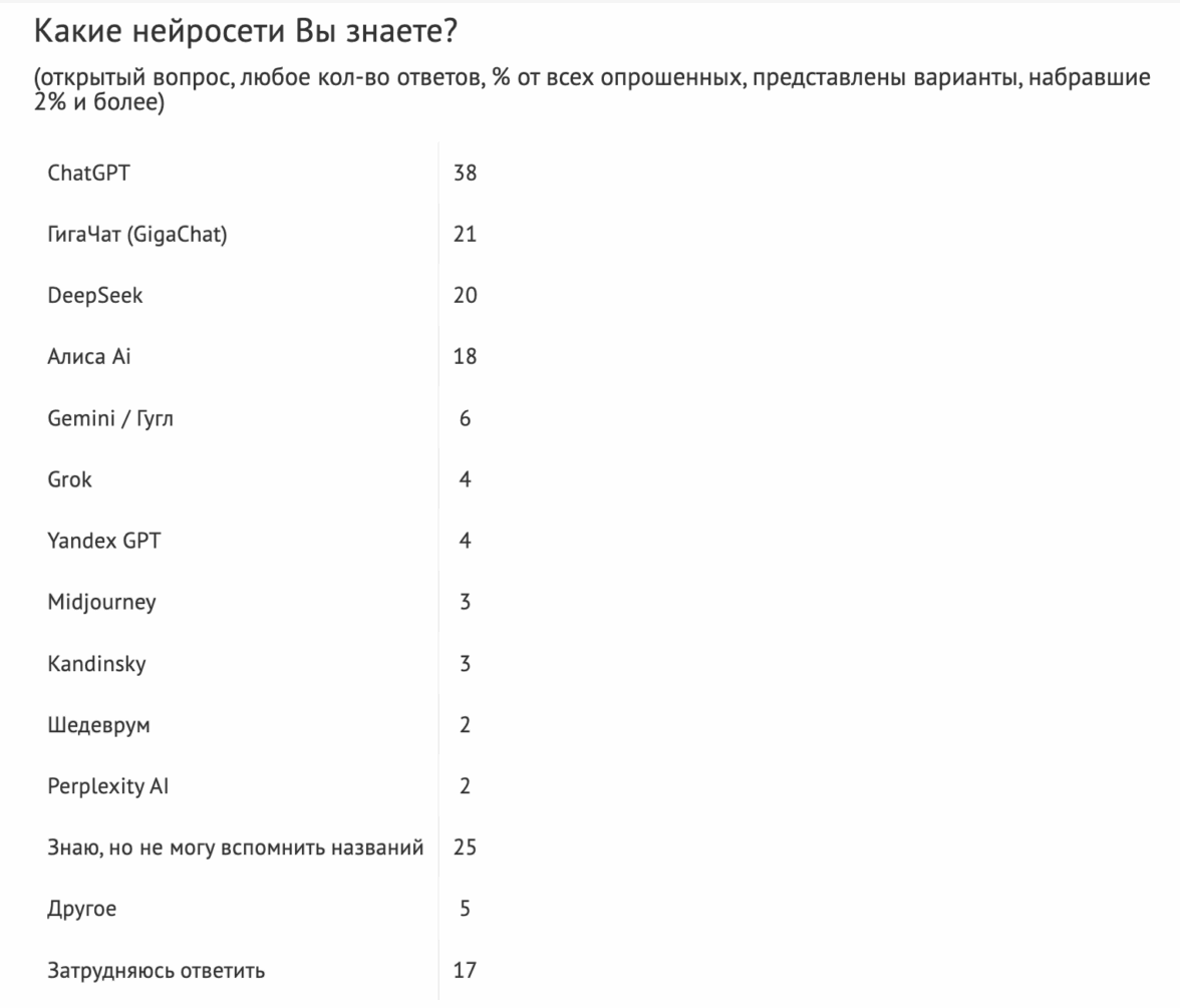 При этом в сентябрьском опросе на вопрос «Какая сеть вам больше всего нравится» самым частым ответом было — «ChatGPT». Такой ответ давал каждый четвертый пользователей нейросети). Вторым по популярности ответом было «DeepSeek» (20%). Отечественные нейросети занимали места с третьего по пятое — YandexGPT (12%), GigaChat (8%), «Шедеврум» (4%). Самой умной нейросетью 30% пользователей называло ChatGPT (DeepSeek — 8%, YandexGPT — 5%, GigaChat — 4%).