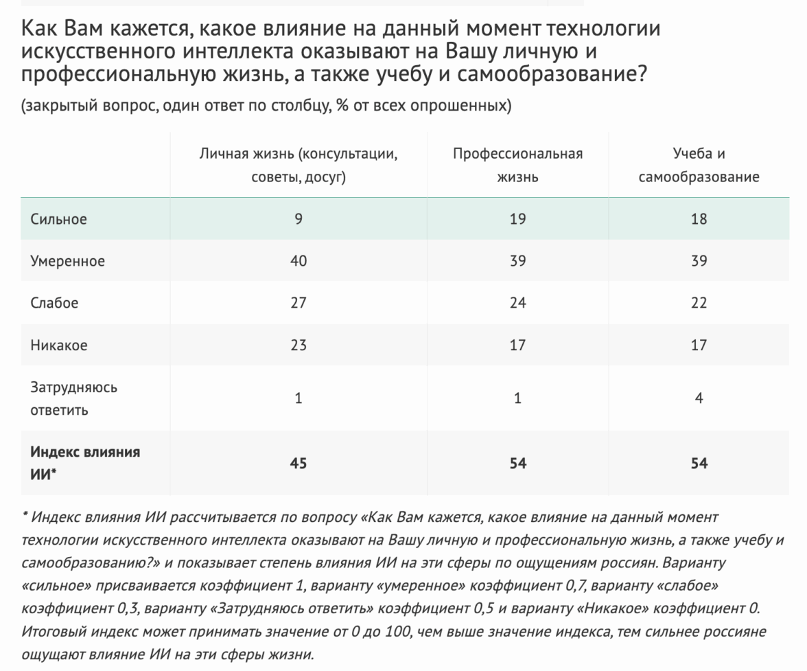 О сильном влиянии ИИ на их личную жизнь сообщило 9% россиян, умеренном — 40%. У 39% россиян ИИ умеренно влияет на профессиональную жизнь, у 19% — сильно. Умеренное влияние на учебу и образование ИИ оказывает у 39% россиян, сильное — у 18%. Примерно каждый пятый россиянин не замечает хоть какого-то влияния ИИ на его жизнь.