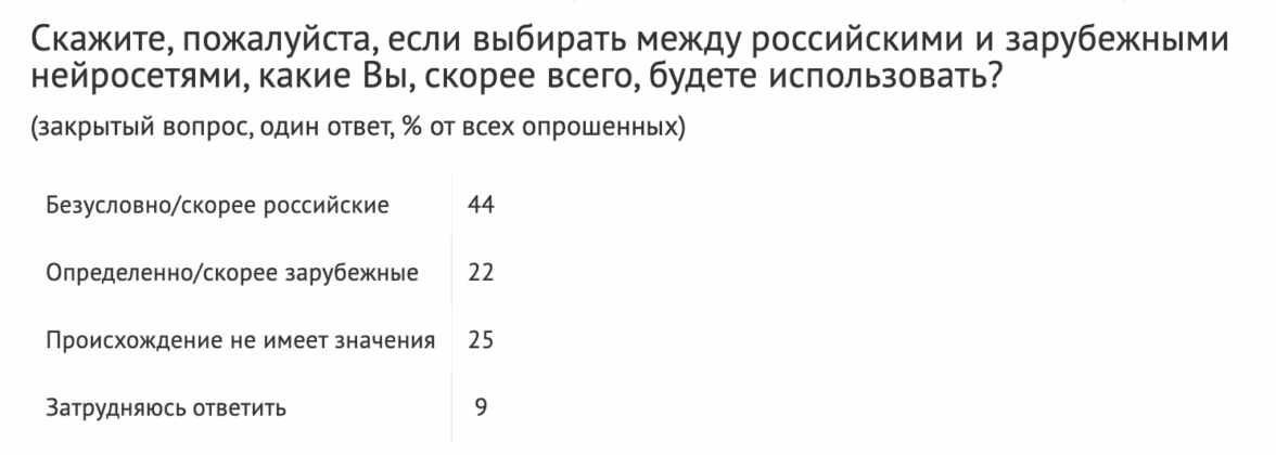 На вопрос «Скажите, пожалуйста, если выбирать между российскими и зарубежными нейросетями, какие Вы, скорее всего, будете использовать?» почти половина (44%) россиян ответила «безусловно/скорее российские». Еще четверть (25%) заявила, что происхождение не имеет значения.