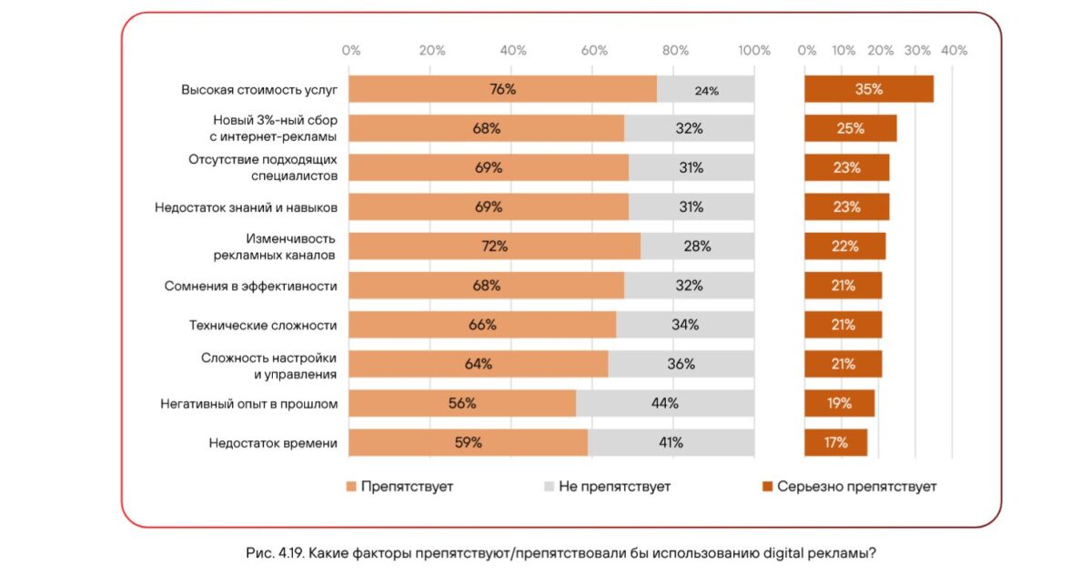 Ключевым барьером активного использования интерактивной рекламы подавляющее большинство (76%) участников опроса назвали ее высокую стоимость. Помимо нее многих беспокоят изменчивость рекламных каналов (72%), дефицит квалифицированных специалистов и собственных знаний (по 69%), введение трехпроцентного сбора (68%), а также сомнения в эффективности инструмента (68%).