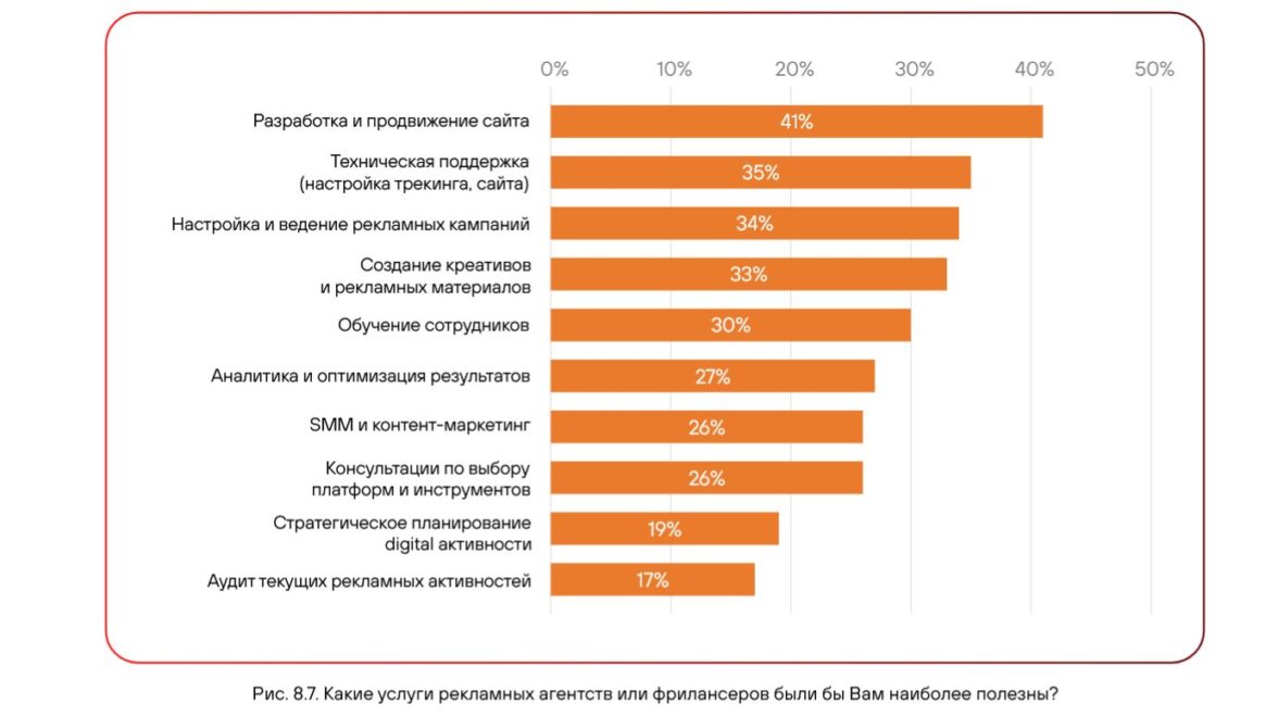 Самыми полезными услугами рекламных агентств или фрилансеров респонденты назвали разработку и продвижение сайта (41%), техническую поддержку (35%), настройку и управление рекламными кампаниями (34%) и создание креативов и рекламных материалов (33%).