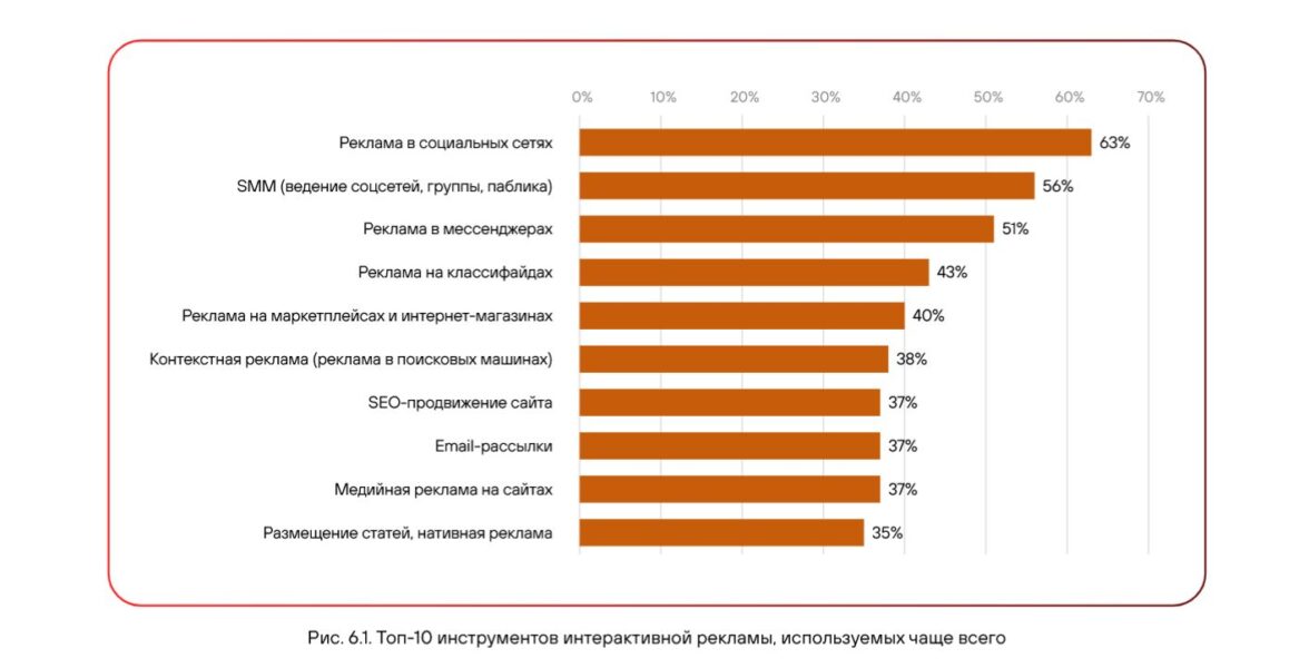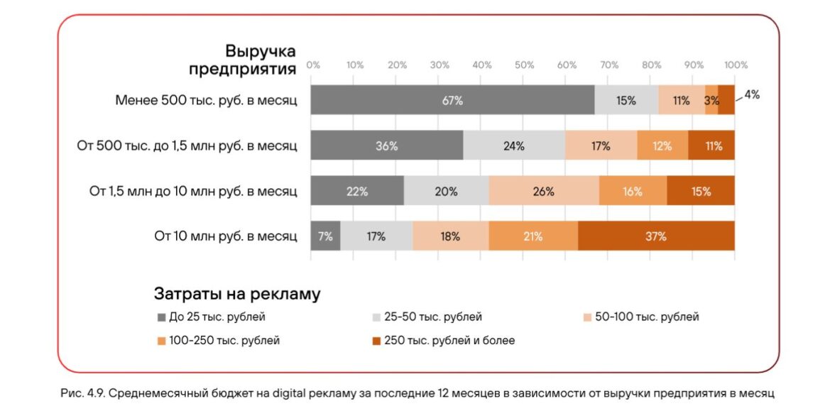 бюджет на интерактивную рекламу по сравнению с 2024 годом — в 1,5–2 раза и более. При этом рекламные бюджеты у малых и средних предприятий невелики. В среднем на интерактивную рекламу в месяц они тратят от 25 тыс. до 50 тыс. рублей — 4-5% от всех своих затрат. Чем больше компания, тем выше затраты. У предприятий с ежемесячной выручкой свыше 10 млн рублей рекламные инвестиции составляют 8-16%.