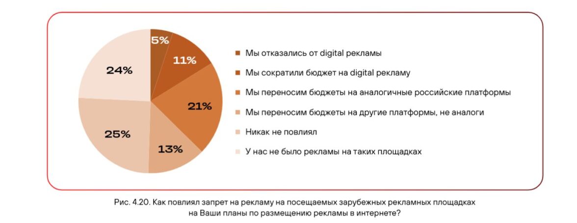 Запрет на размещение рекламы на зарубежных площадках повлиял на стратегию 51% респондентов, подтолкнув их к переходу на российские аналоги (21%) или освоению альтернативных площадок (13%).