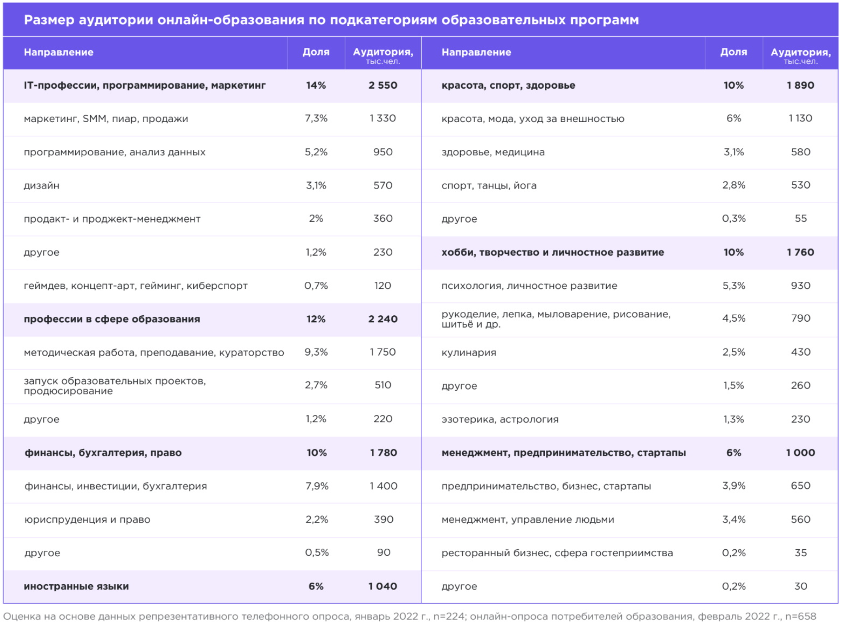 В 2021 году граждане впервые потратили на онлайн-обучение больше, чем на офлайн. Обучилось 19,6% взрослого населения России. В лидерах — IT-профессии. За ними следуют программы в сфере образования. Замыкают список йога и астрология. Бурный рост рынка EdTech в России прервали события в Украине.