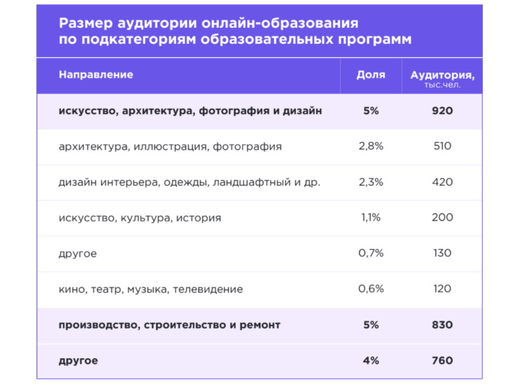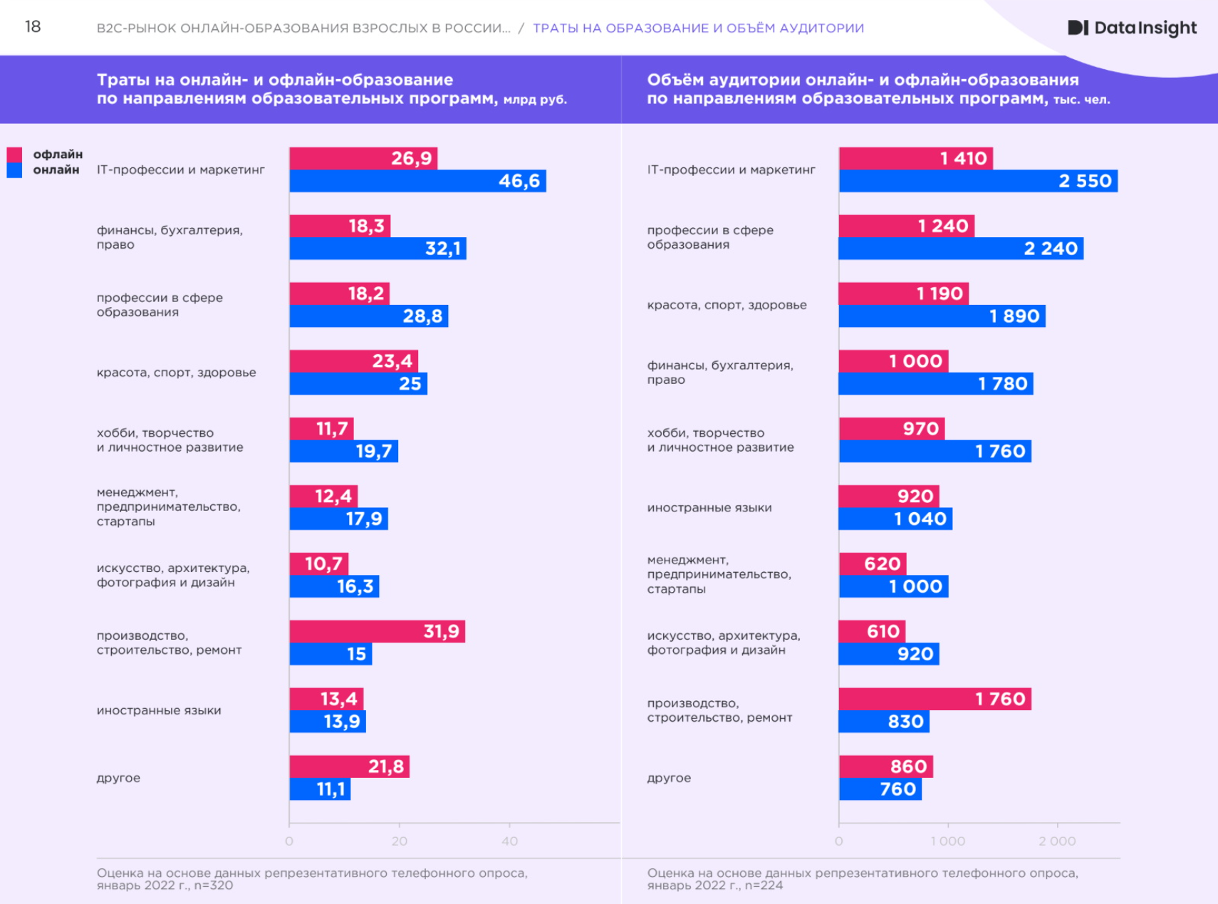 Траты на обучение распределились в соответствии с интересами студентов. Больше всего EdTech-индустрия заработала на обучении IT-направлениям и маркетингу — 46,6 млрд рублей. В офлайне лидирующая категория «производство, строительство и ремонт» принесла 31,9 млрд рублей.