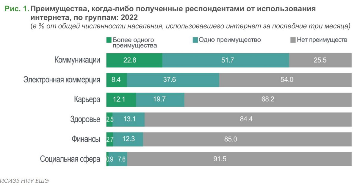 82,5% россиян пользуется интернетом, а 55,5% извлекают из этого выгоду, выяснили в НИУ ВШЭ. По мнению большинства, интернет кардинально улучшил возможность общения с друзьями и близкими. Почти половина россиян считает, что получает пользу от электронной коммерции, в треть использует сеть для карьерного роста.