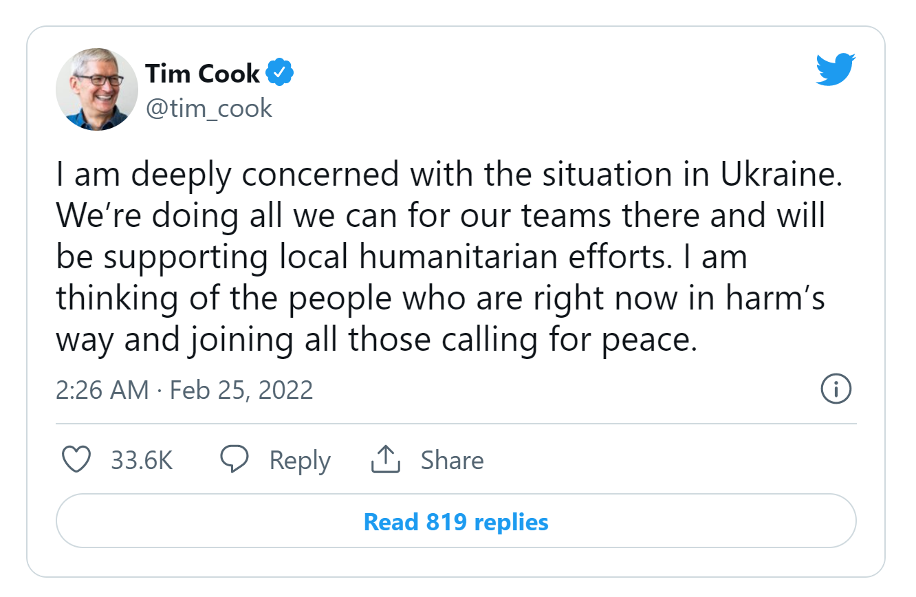 Генеральный директор Apple Тим Кук выразил глубокую обеспокоенность событиями в Украине. Начало вторжения российских войск совпало с днем рождения Стива Джобса — 24 февраля основателю компании исполнилось бы 67 лет. В своем Twitter Кук вспомнил призыв идейного вдохновителя Apple «оставить лучший мир, чем тот, который мы получили».