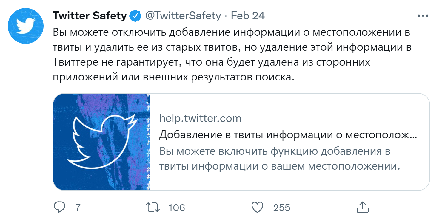 Twitter предупреждает пользователей в Украине о необходимости защищать свои аккаунты: использовать многофакторную аутентификацию и отключать определение местоположения при публикации твитов. Серия твитов с ссылками на справку появилась 24 февраля на официальном аккаунте Twitter Safety.