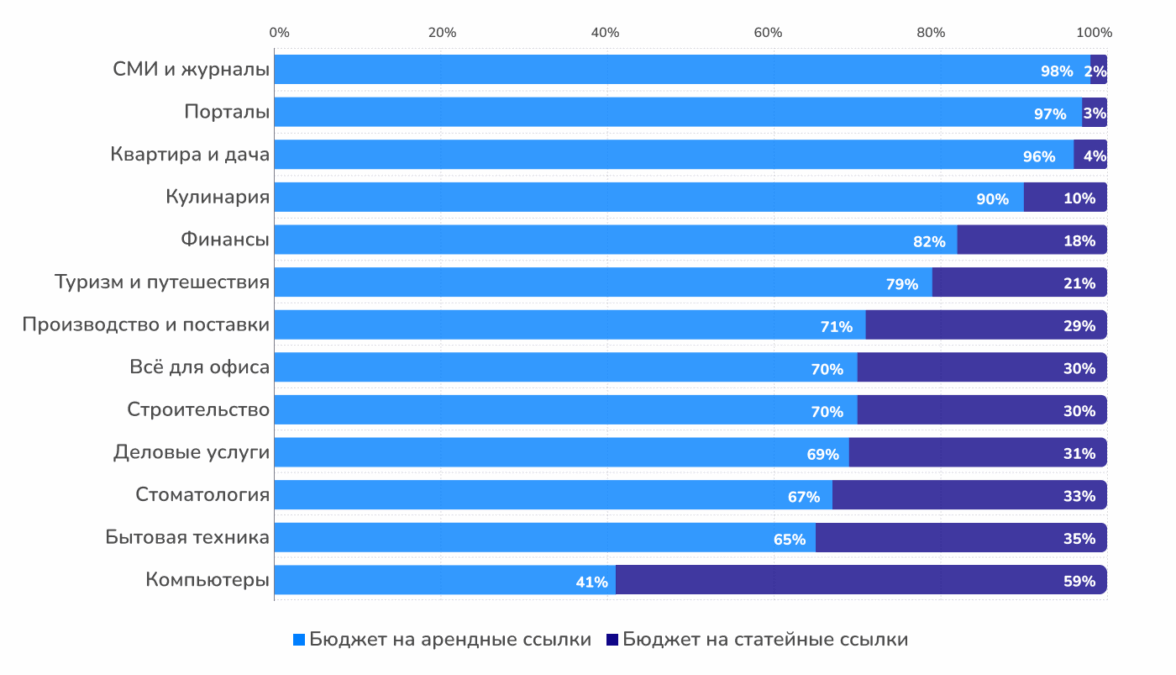Многие из ниш успешно комбинируют ссылки разных форматов. Арендные ссылки (составляют более 80% бюджета в тематиках «СМИ и журналы», «Порталы», «Квартира и дача», «Кулинария», «Финансы») используют для широкого охвата запросов. Статейные ссылки чаще применяют в тематиках, где важны устойчивость и доверие (например, «Компьютеры», «Бытовая техника», «Стоматология»), для точечного усиления позиций.