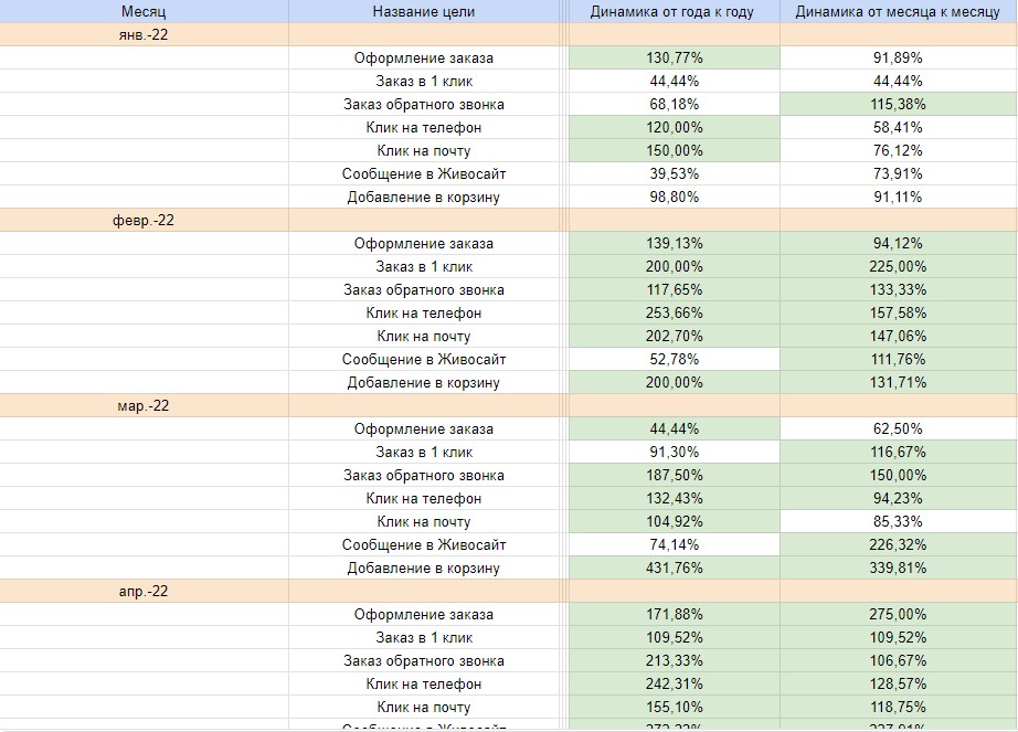 По итогам каждого месяца мы сводили таблицу результатов, сравнивали динамику от года к году, от месяца к месяцу. После двух месяцев работы, на которые пришлось исправление критических ошибок, динамика оставалась положительной — количество лидов стабильно возрастало.