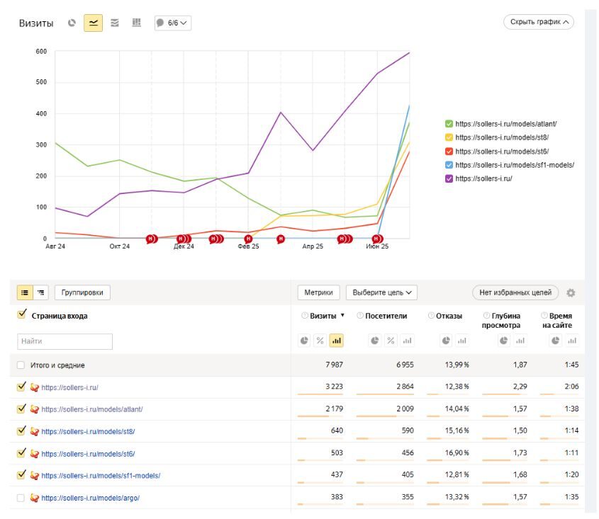 По данным Яндекс.Метрики, трафик вырос с 663 визитов в мае до 2253 визитов в июле 2025 года — в 3,4 раза. Причем рост пришелся не на информационные страницы, а на ключевые коммерческие разделы: модели и блок «Авто в наличии». Это означает, что увеличился именно поток целевых пользователей, заинтересованных в покупке.