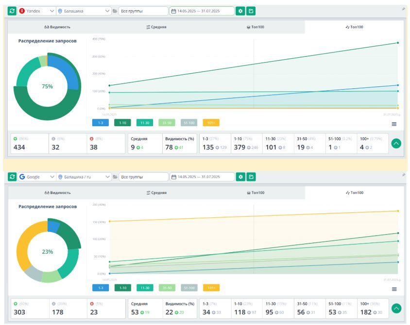 Google: средняя позиция улучшилась до 53 (+19 позиций), видимость выросла до 22 (+20%).