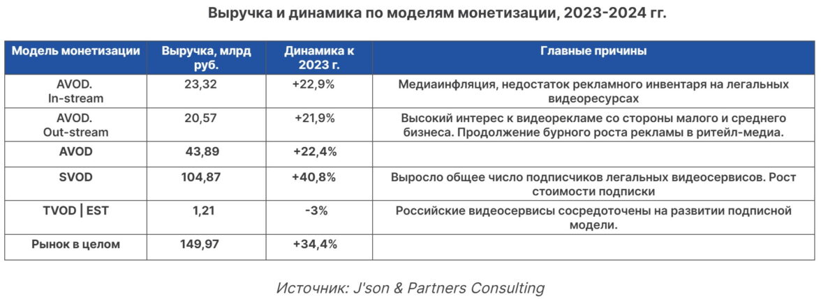 Эта общая сумма включает три ключевых источника дохода: поступления от платных подписок (SVOD — Subscription Video on Demand), доходы от размещения рекламы (AVOD — Advertising Video on Demand), а также средства, полученные от продажи и временного предоставления отдельным пользователям цифровых копий контента.