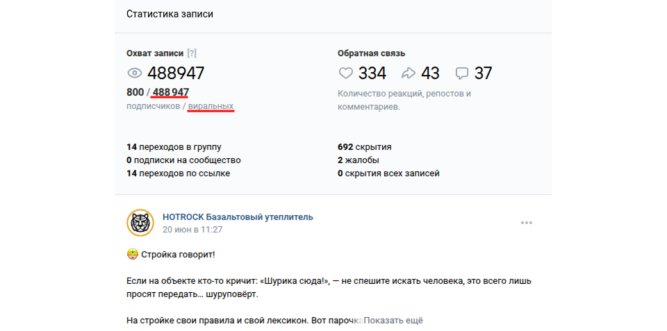 Июнь 2025 — конкурс «Сделано в России — проверено вами» + пост-бомба 23 июня вышел «Словарь строительного сленга» — обычный полезный пост без рекламы. Результат: 1 170 000 просмотров, из них ~95 % виральные. Пост несколько дней висел в топе рекомендаций ВКонтакте.