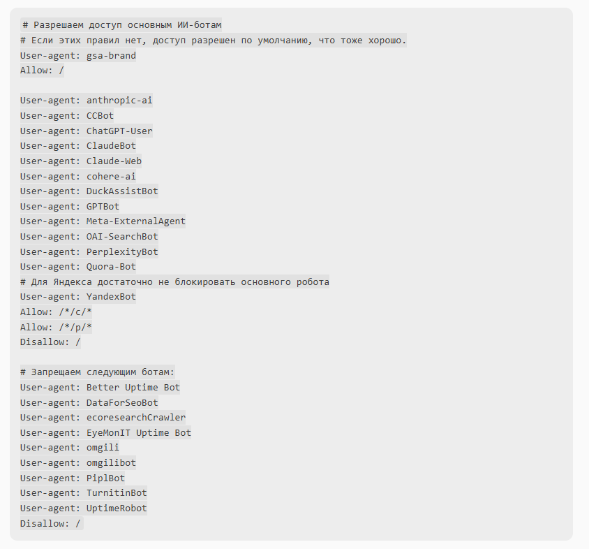 Но ваша задача — прямо противоположная. Чтобы ИИ мог цитировать ваш контент, ему нужно предоставить полный доступ. Поэтому необходимо проверить, что ваш robots.txt не содержит запрещающих правил для ключевых ИИ-краулеров.