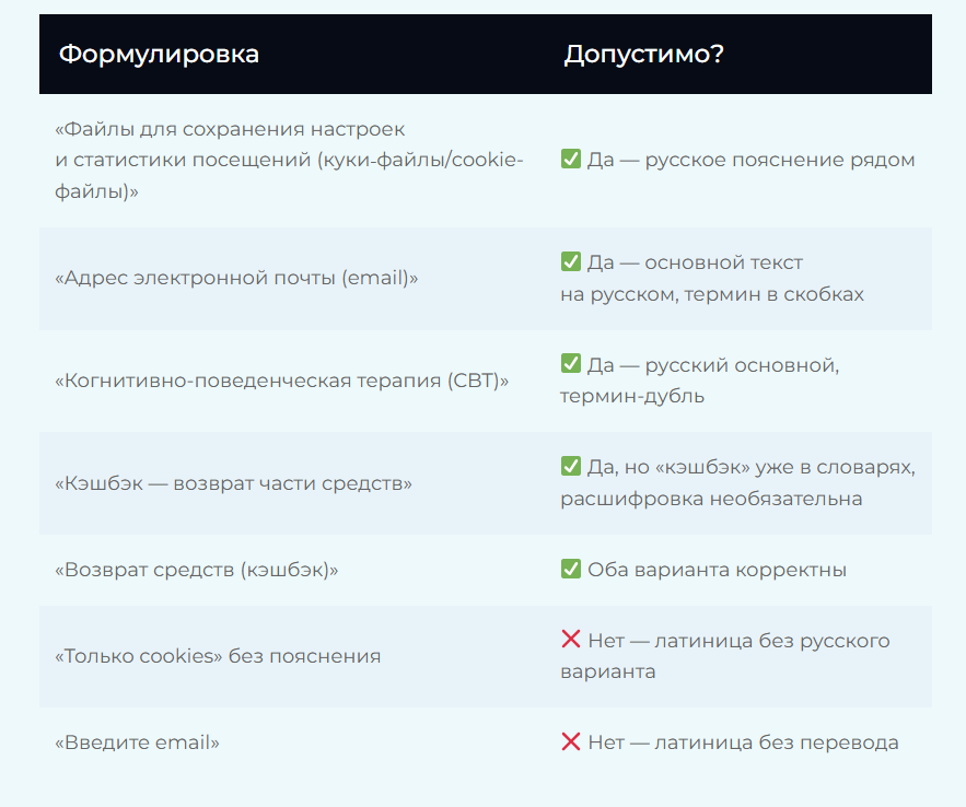 Иностранные слова не запрещены полностью — их можно использовать как дубль, но только при условии, что русский вариант равнозначен по смыслу и сопоставим по оформлению: тот же размер шрифта, цвет, расположение. Прятать русский перевод мелким текстом или в сноску — нарушение.