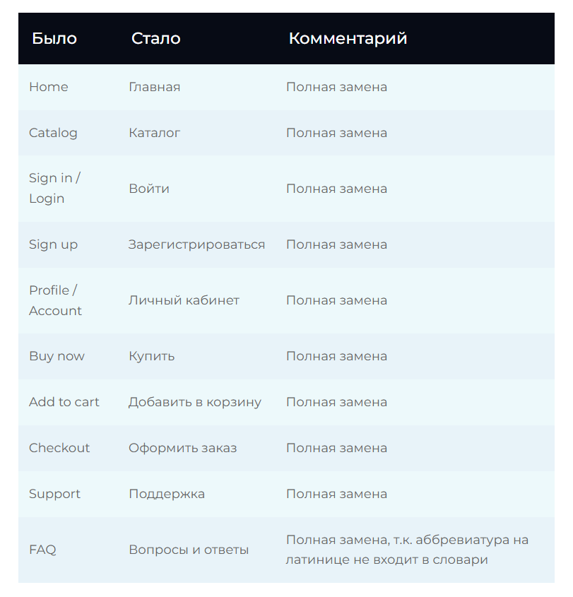 1. Провести аудит сайта: собрать все иностранные слова из меню, кнопок, форм, карточек товаров, баннеров, документов.