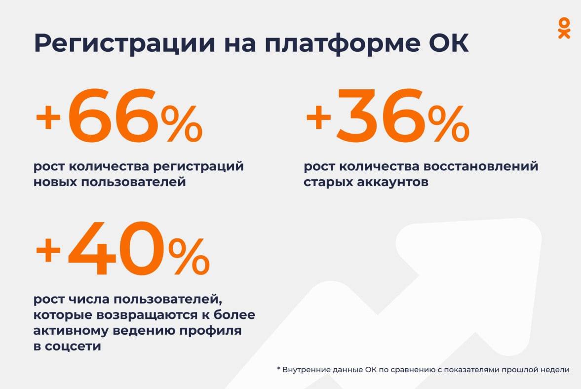 «Одноклассники» сообщили о резком притоке аудитории. С начала марта рост регистраций пользователей в ОК превысил 66%. Рост восстановлений старых аккаунтов составил 36% по сравнению с предыдущей неделей, а рост числа пользователей, которые стали более активно вести соцсеть, составил более 40%, пишет ТАСС со ссылкой на сообщение компании.