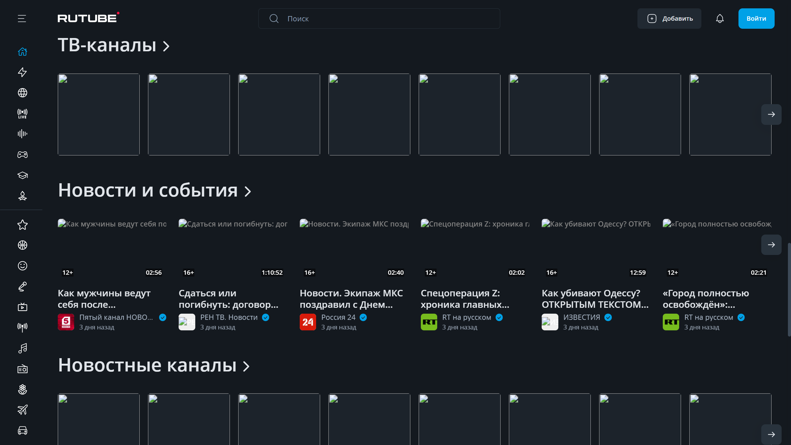 Также не загружаются изображения предварительного просмотра разделов новостей, телеканалов и рекомендованных видеороликов. Интересно, что при наведении курсора на битые изображения видеоролик начинает проигрываться, то есть со стримом в этой части сайта все в порядке.