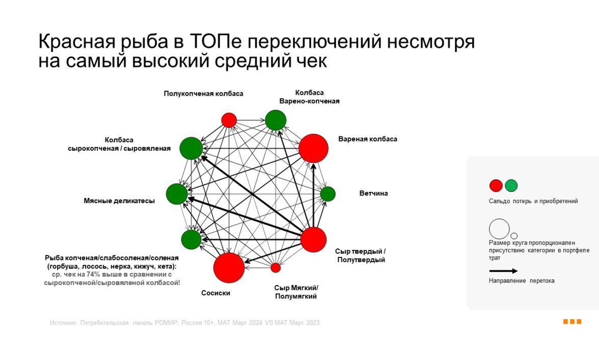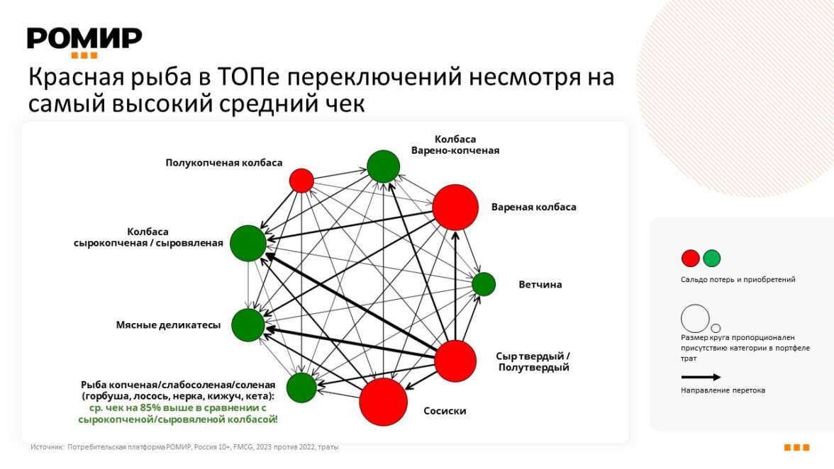 Однако, стоит отметить, что снижение среднего чека по красной рыбе по сравнению с 2023 годом может быть связано с активным развитием собственных торговых марок (СТМ) и предложением продуктовых сетей выгодных цен по скидкам и промо-акциям. Это позволяет потребителю более часто покупать красную рыбу и разнообразить свой рацион.