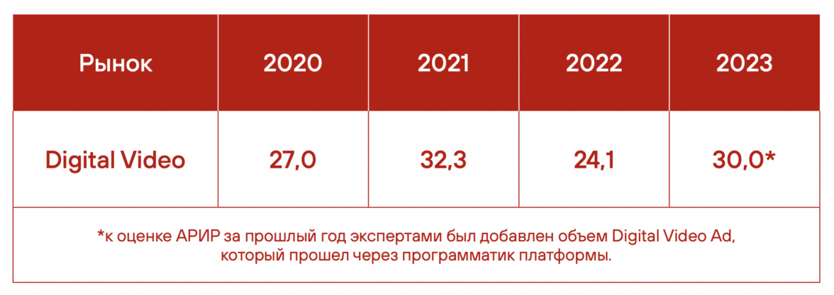 Объем рынка видеорекламы в интернетеПо обновленным данным АРИР, объем рынка цифровой видеорекламы 2023 году составил 30 млрд рублей. К оценке АРИР за прошлый год был добавлен сегмент, который прошел через программатик-платформы. По данным ассоциации, весь рынок интерактивной рекламы и продвижения в интернете в 2023 году достиг исторического максимума и составил 807 млрд рублей.