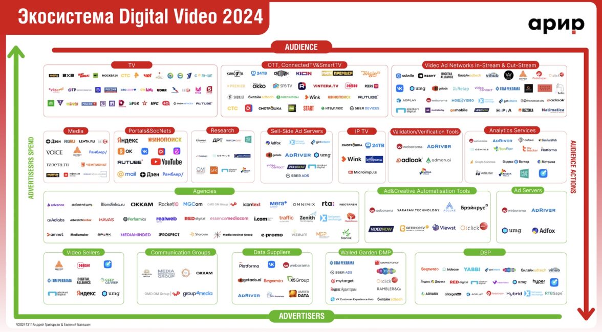 White Paper содержит карту экосистемы Digital Video. В этом году эксперты не стали вносить изменения в блоки экосистемы, но расширили состав игроков. Проект поможет составить OLV-микс и найти подрядчиков по любому из направлений Digital Video Ad.