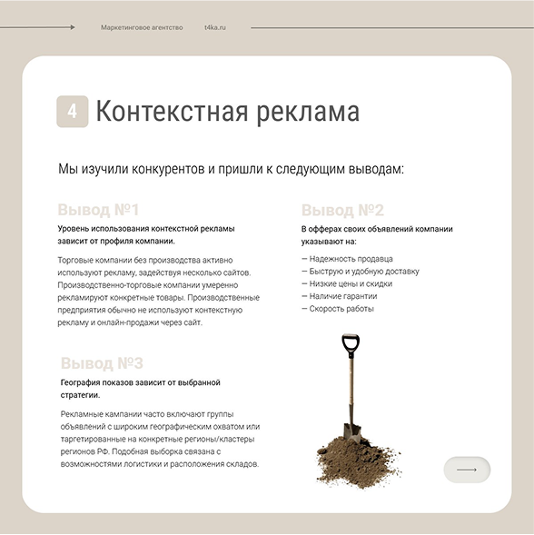 Для клиента было особенно важно получить информацию о том, как конкуренты используют контекстную рекламу. Поэтому в соответствующей сводке мы большое внимание уделили конкретным примерам объявлений конкурентов в контексте и РСЯ, регионам показов, бюджетам.