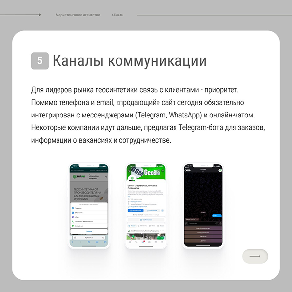 Для лидеров рынка геосинтетики связь с клиентами — приоритет.Помимо телефона и email, «продающий» сайт сегодня обязательно интегрирован с мессенджерами (Telegram, WhatsApp) и онлайн-чатом.