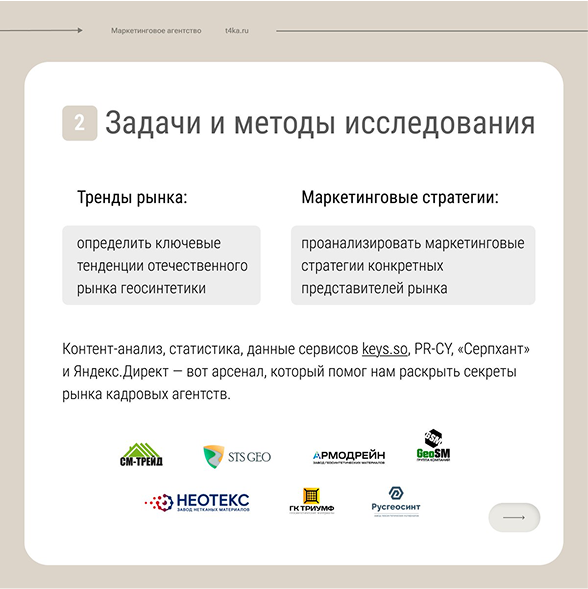 Блок 2. Во втором блоке провели анализ конкурентов и их маркетинговых стратегий. В качестве конкурентов были выбраны компании: «Русгеосинт», ГК GeoSM, «Армодрейн», ГК «Триумф», «СМ ТРЕЙД», STSGEO, ЗНМ «НЕОТЕКС», ФНМ «Алькар», «Старатель», GEOFORT.