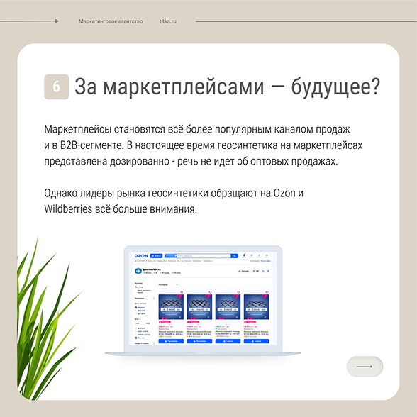Маркетплейсы становятся всё более популярным каналом продаж и в B2B-сегменте. В настоящее время геосинтетика на маркетплейсах представлена дозированно — речь не идет об оптовых продажах. Однако лидеры рынка геосинтетики обращают на Ozon и Wildberries всё больше внимания.
