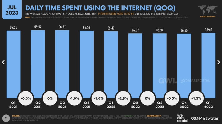 В сравнении с началом 2023 года, к середине лета пользовательское время в Интернете выросло на 1,3%. Теперь в среднем люди проводят онлайн около 6 часов 40 минут.