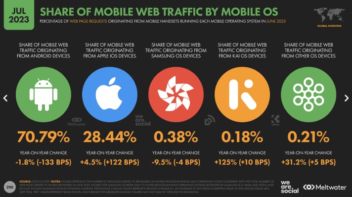 Как показывают данные We Are Social и Meltwater, доля мобильного трафика от девайсов с ОС Android равна 70,79%. В то же время, доля девайсов с ОС Apple — 28,44%.