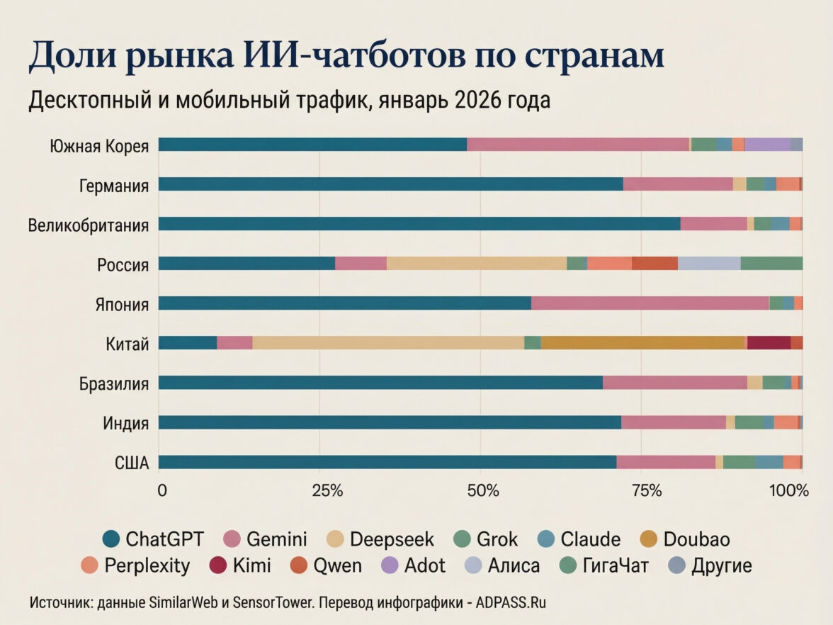 Данные a16z по долям рынка ИИ-чатботов в России следующие: DeepSeek — 29%, ChatGPT — 27%, «Алиса» — 10%, «ГигаЧат» — 9%, Gemini — 8%, Perplexity — 7%, Qwen — 7%, Grok — 3%. Россия — единственная крупная страна помимо Китая, где ChatGPT не на первом месте.