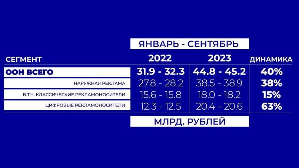 Рынок наружной рекламы по итогам трех кварталов 2023 года вырос на 38% год к году до 38,5–38,9 млрд рублей.