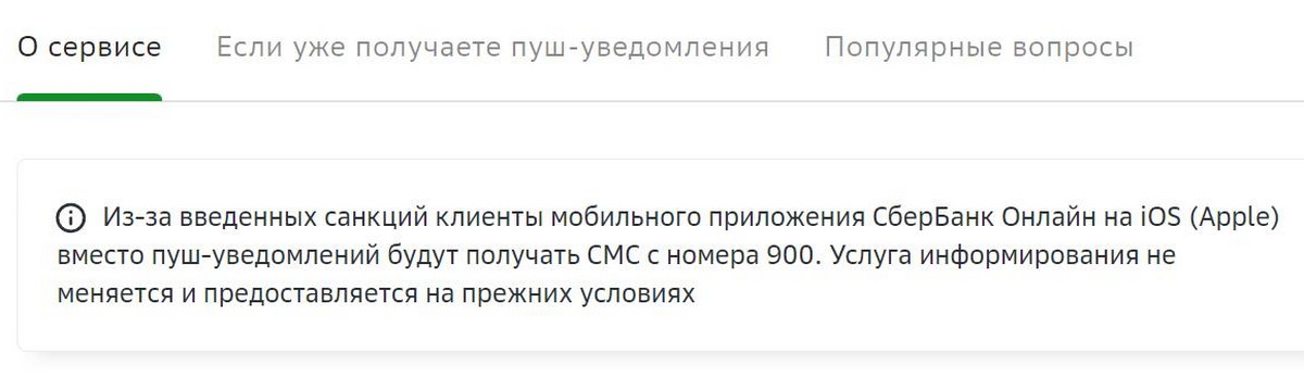 Отказ банков от push-уведомлений вызван санкциями, введенными против них. В конце февраля 2022 года из App Store и Google Play были удалены приложения подсанкционных российских банков. Чистка магазинов приложений затронула «Сбер», ВТБ, Альфа-банк, «Открытие», Совкомбанк, Промсвязьбанк и Новикомбанк. Компания Apple не просто удалила приложения из своего каталога, но и закрыла им доступ к службе push-уведомлений Apple Push Notification. Из-за этого запуск альтернативных приложений, таких как СБОЛ от «Сбера», не решил проблему. Как сообщается на сайте банка: «Из-за введенных санкций клиенты мобильного приложения „Сбербанк онлайн“ на iOS (Apple) вместо push-уведомлений будут получать sms с номера 900».