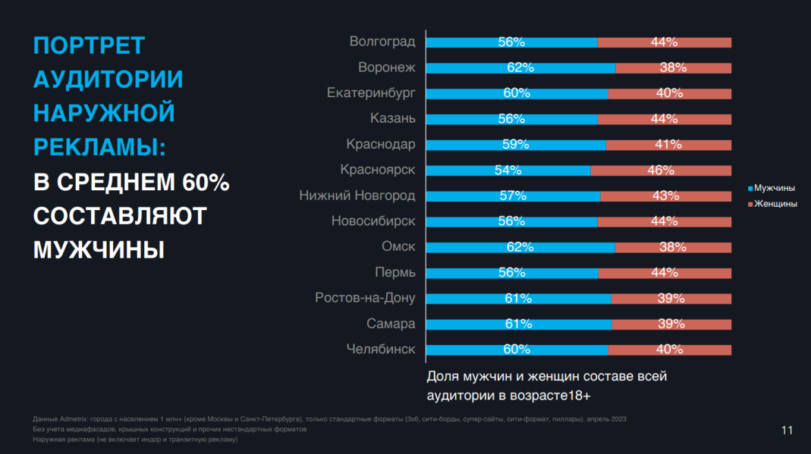 В общем объёме аудитории наружной рекламы в крупных городах России на мужчин приходится, в среднем, 60%.