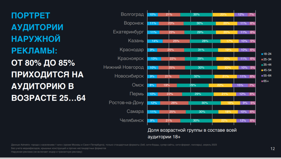 Аудитория в возрасте от 24 до 64 лет составляет 80–85% от всех имеющих возможность видеть рекламу. По отдельно взятым городам отличия в профиле аудитории незначительны, но они есть, и их можно учитывать при планировании рекламной кампании.