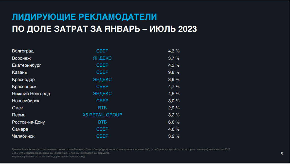 Наиболее активно в outdoor-продвижение в регионах вкладывают федеральные рекламодатели. На первом месте по объёму затрат на наружную рекламу в городах-миллионниках в разных городах оказались «Сбер», «Яндекс», ВТБ и X5 Retail Group.