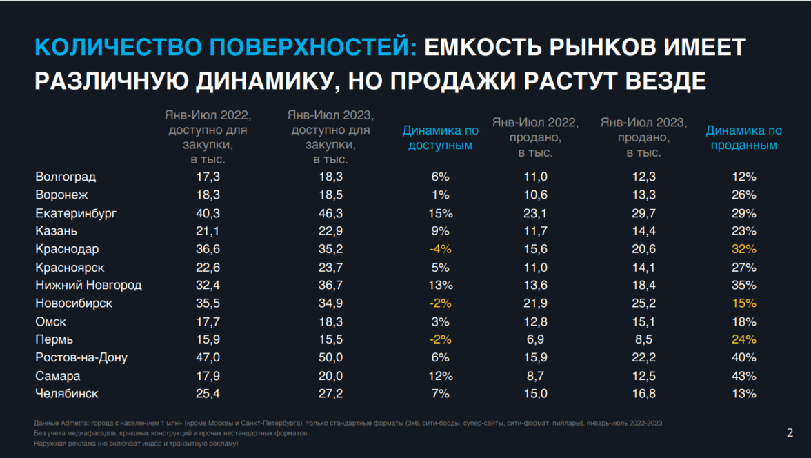 Ёмкость рынков характеризуется различной динамикой. Число рекламных поверхностей, доступных для закупки, в городах-миллионниках колеблется как в сторону увеличения, так и в сторону уменьшения, но в среднем растёт. При этом количество проданных поверхностей значительно выросло во всех анализируемых городах. Наибольшая динамика по объёму проданных рекламоносителей в Краснодаре, где этот показатель в период январь-июль 2023 года вырос на 32% по сравнению с аналогичным периодом 2022 года. Примечательно, что рост продаж в этом городе происходит на фоне сокращения количества доступных к покупке рекламных поверхностей.