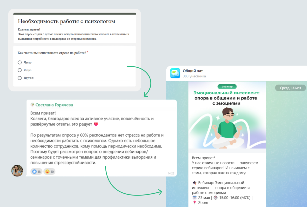 Культура обратной связи. Стали регулярно собирать вопросы, которые интересуют команду. Все инициативы анализируются, рабочие идеи идут в реализацию.