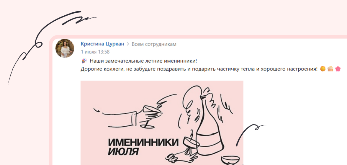 В Sidorin Lab было принято поздравлять сотрудников с днем рождения. А когда ушел человек, который этим занимался, традиция сошла на нет. Пообщавшись с командой, я поняла, что эти поздравления вспоминают с теплотой. Решили вернуть добрый обычай, сменив формат: не просто сообщение в чат, а календарь дней рождения в компании.