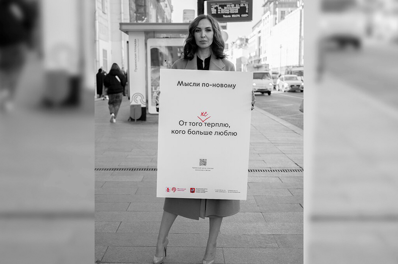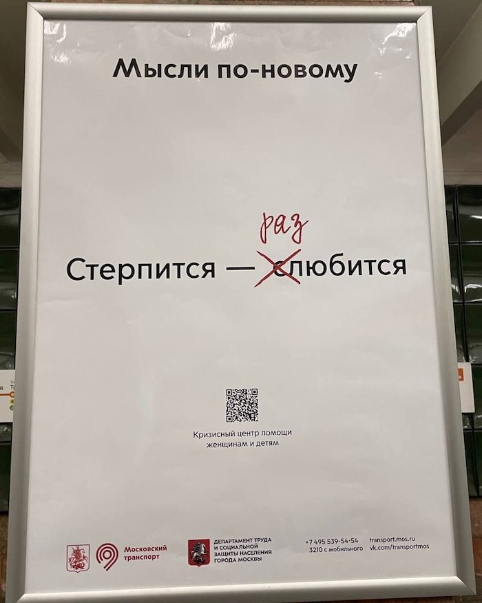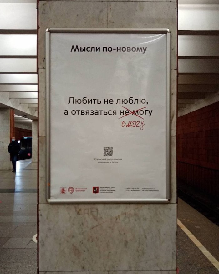Рекламную кампанию «Мысли по-новому» запустили столичный департамент труда и социальной защиты населения совместно с департаментом транспорта и развития дорожно-транспортной инфраструктуры. В ней обыгрываются клишированные фразы из серии «стерпится — слюбится». Основный посыл рекламной кампании — насилие терпеть нельзя.