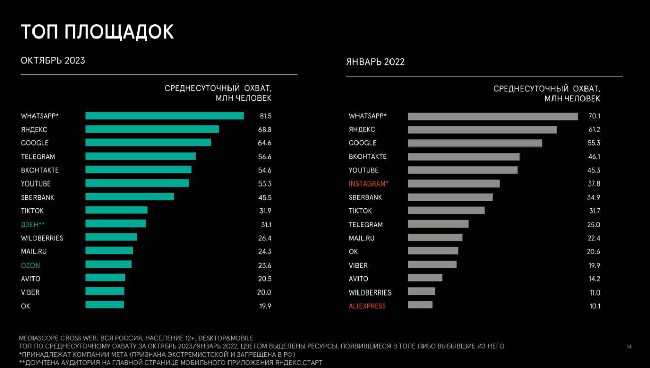 По данным Mediascope, обнародованным на последнем НРФ, в январе 2022 года среднесуточный охват Telegram в России составлял 25 млн человек, а в октябре 2023 года показатель увеличился более чем вдвое — до 56,6 млн. Мессенджер поднялся с девятой на четвертую позицию среди площадок и превзошел TikTok, YouTube и «ВКонтакте». Позиции в топ-3, как в прошлом году, продолжают удерживать WhatsApp и поисковики «Яндекс» и Google.